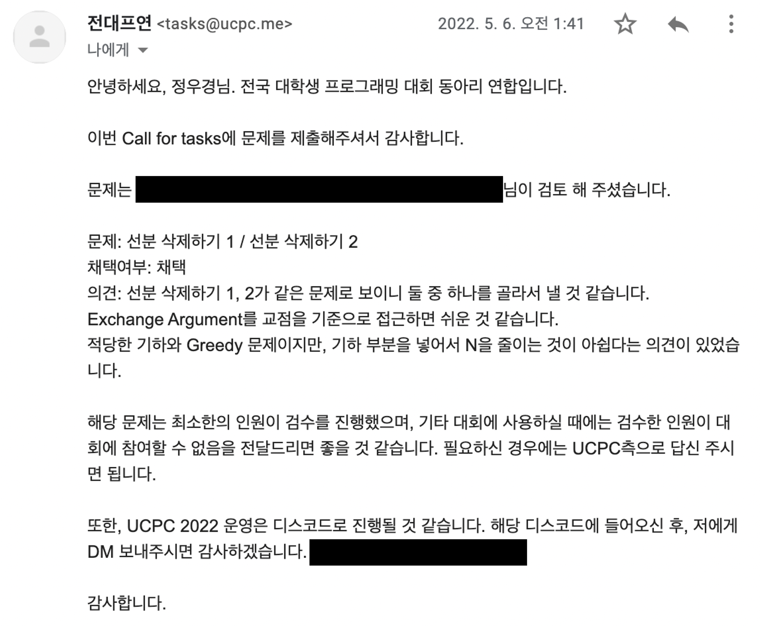출제진이 되면 다른 출제진들을 만날 수 있을 것이기에, Call for Tasks가 이러한 갈증을 해결할 좋은 기회라고 생각했습니다. 그래서 당시 생각해 둔 아이디어를 급하게 문제로 만들어 Call for Tasks에 제출했습니다. 사실 그렇게 많은 기대를 하지는 않았습니다. 객관적으로 그렇게 좋은 문제는 아니라고 생각했습니다. 그런데 놀랍게도 제 문제가 채택되었습니다. 새벽에 동아리방에서 메일을 확인하고 혼자 기뻐서 소리를 질렀던 기억이 납니다.