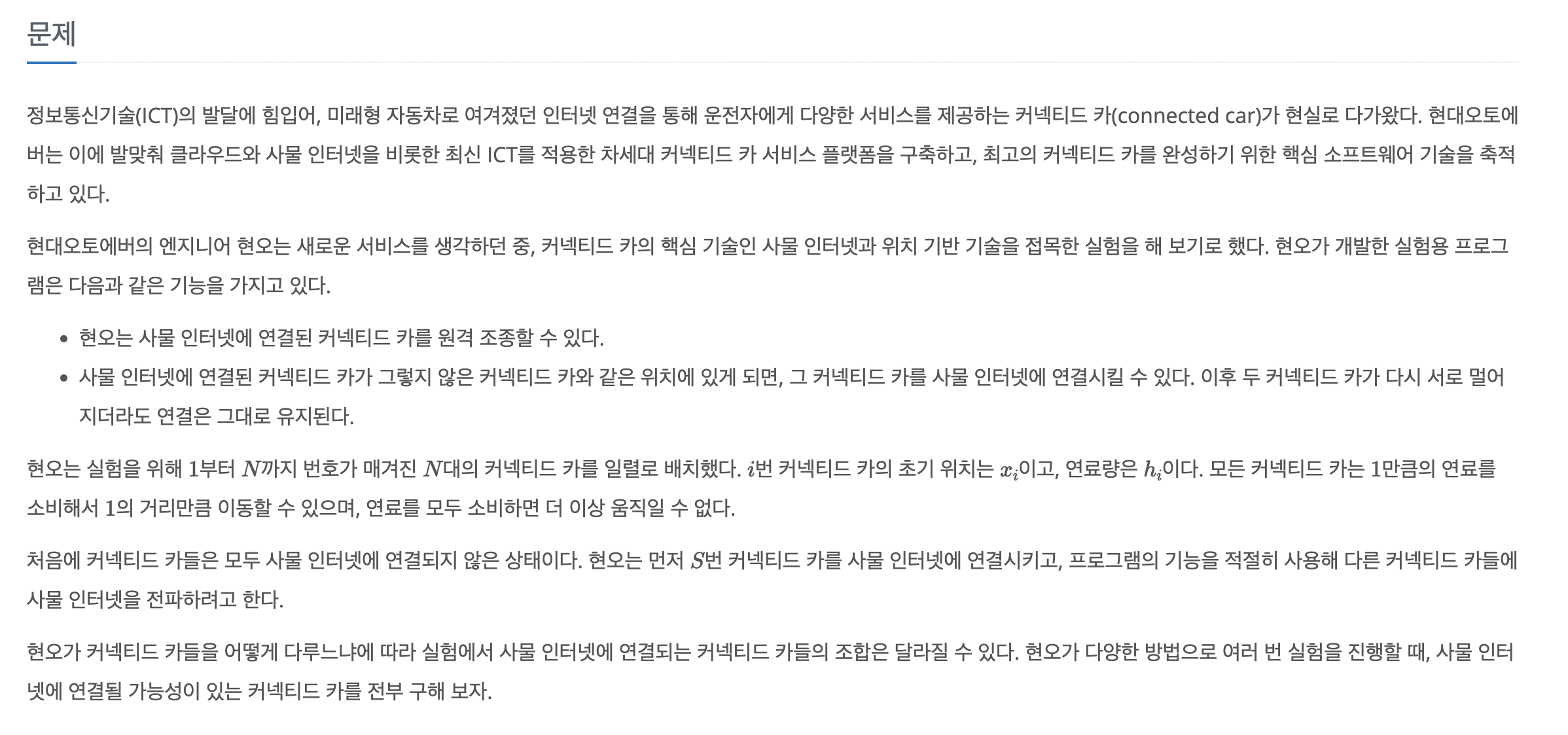많은 기업에서 UCPC를 후원해주십니다. UCPC에서는 다양한 방식으로 스폰서들을 홍보하는데, 문제의 지문에 해당 기업을 홍보하는 내용을 넣기도 합니다. 커넥티드 카 실험은 현대오토에버의 스폰서 문제였습니다. 어떤 기업을 광고하는 문제라는 점에서 이 문제의 지문을 작성하는 것은 흥미로웠습니다. 현대오토에버에서 개발한 소프트웨어 플랫폼 모빌진, 현대차 그룹의 AI 기반 차량 OS인 ccOS 등 다양한 소재로 지문을 작성해 보았는데, 최종 버전은 아래와 같습니다. 최종 버전의 지문은 대부분 doju님께서 작성해주셨습니다.