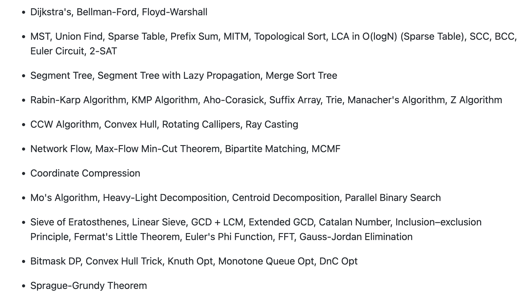 한 가지 아쉬움이 남는 부분이 있습니다. 다양한 알고리즘/자료구조를 공부했지만, 아직도 공부하지 못한 주제가 많습니다. 그런 탓에 후술할 팀 연습에서 배경 지식 부족으로 풀지 못한 문제들이 많았습니다. 아래는 알고리즘 대회에 출제되지만 아직 저희 팀이 공부하지 못한 알고리즘/자료구조 모음입니다. 사실 처음 계획한 분량은 거의 다 공부했지만, 아래의 주제들이 알고리즘 대회에 출제된다는 사실을 잘 몰랐습니다. 알았더라면 무리해서라도 아래의 주제들까지 공부했을 것 같습니다.
