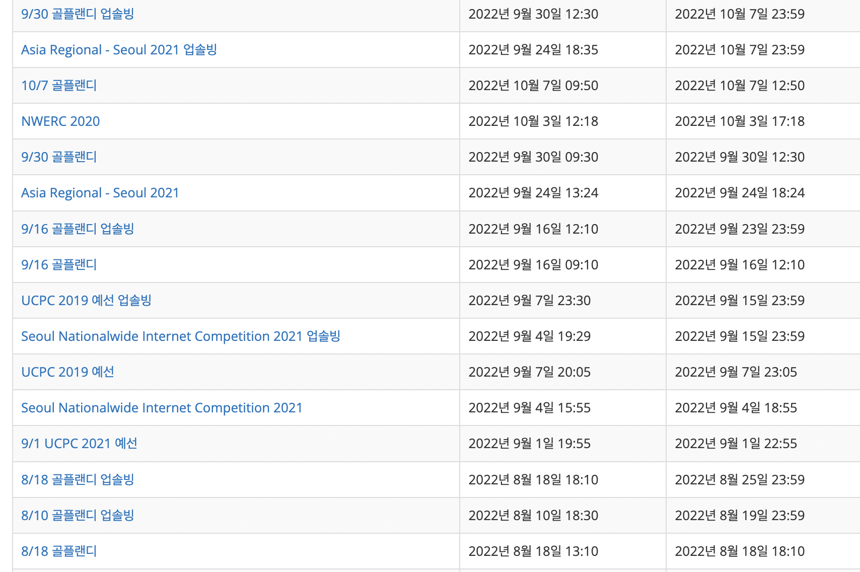 ICPC 예선 이후에는 주로 플랜디(백준에서 플래티넘 문제들을 랜덤으로 골라 푸는 연습 방법)를 했습니다. ICPC 2021 본선 기록으로 미루어 볼 때, 수상권에 들기 위해서는 정확히 플래티넘 문제들까지 모두 풀어야 한다고 예상했기 때문입니다. 당시 저희 팀은 골드 문제까지는 무난히 풀어냈기 때문에(간혹 골드 1 난이도의 문제를 놓치기는 했습니다), 승부처는 플래티넘 문제가 될 것이라고 판단했습니다.