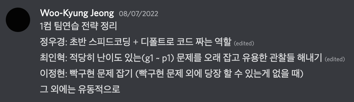 4월입니다. 팀원을 정해야 했습니다. 팀원 후보들을 정리하고, 우선순위가 높은 분들부터 컨택했습니다. 당시 전북대학교에는 저를 포함해서 ICPC 본선 수상권의 실력자가 없었습니다. 그에 근접하는 분들도 없었습니다. 따라서 어떤 분들과 팀을 하든, 오랜 기간 연습하고 실력을 높여야 했습니다. 이런 이유에서 현재의 실력이 아닌 잠재력에 따라 팀원 분들을 컨택했습니다. 감사하게도 가장 먼저 컨택한 두 분이 흔쾌히 팀원 제의를 수락해주셨습니다. 최인혁님, 이정현님과 함께하게 됐습니다.
