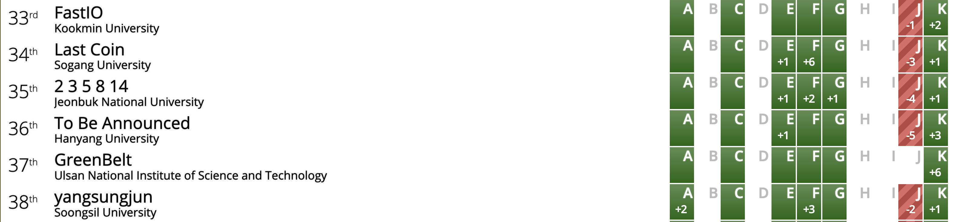 ICPC 예선입니다. 결과부터 말하자면 전체 35등(교내 1등)을 차지했습니다. 저희 팀이 4월 전까지 얼마나 실력이 없었는가를 고려하면 좋은 성과지만, 목표가 ICPC 본선 수상이라는 점을 고려하면 부족한 성과입니다.