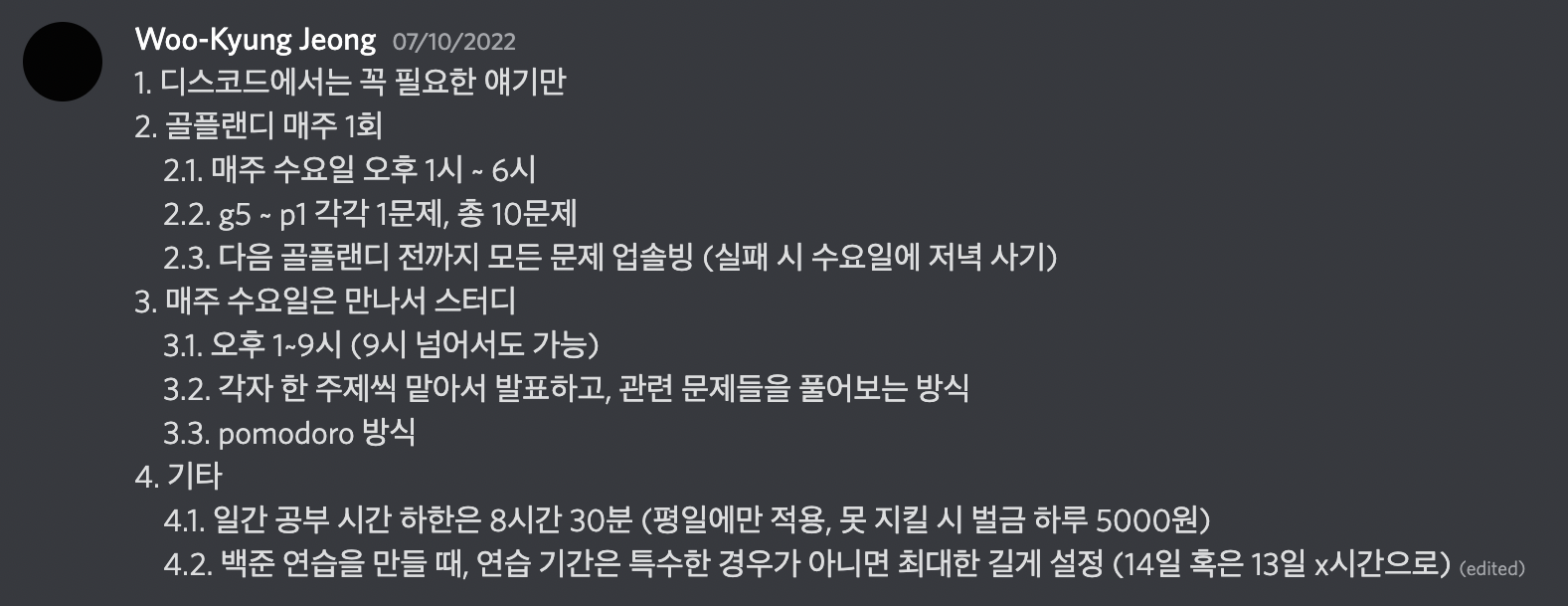 학기 중에는 신경 쓸 일들이 많습니다. 과제, 시험 공부.. 특히 최인혁님은 대학원 준비와 동아리 회장 업무까지 겹쳐 상당히 바빴습니다. 그래서 상대적으로 한가한 여름 방학 때 최대한 많이 공부하기로 했습니다. 구체적으로 평일에는 하루에 최소 8시간 30분 이상 공부하고, 이를 달성하지 못할 시 하루에 5000원의 벌금을 내기로 했습니다.