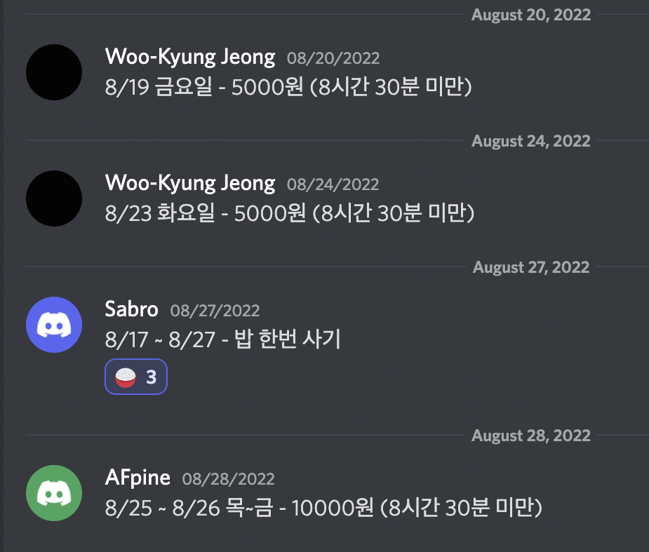 저는 사실 하루에 8시간 30분은 그리 많다고 생각하지 않습니다. 8시간 30분은 최소한의 기준이었습니다. 그러나 지치는 것은 어쩔 수 없었습니다. 8월 즈음부터는 다들 규칙을 잘 지키지 못했습니다.