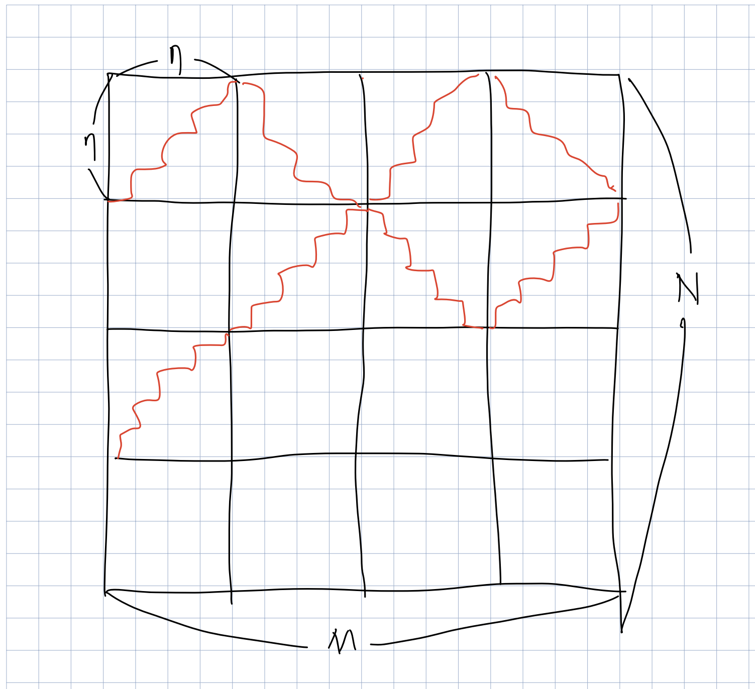 이제 뱀들을 모두 합쳐 하나의 뱀으로 생각할 수 있습니다. $N \times M$ 크기의 격자를 $7 \times 7$ 크기의 격자들로 나누고, 각각의 $7 \times 7$ 격자 내에서 가능한 뱀의 이동 방향을 고정하여 dag로 생각할 수 있습니다. 예를 들어 오른쪽과 아래쪽으로만 이동하도록 한다면 dag가 됩니다. 방향을 고정하였기 때문에 각각의 $7 \times 7$ 격자에서 뱀은 $13$개의 칸을 밟게 됩니다. $49$개의 칸 중 $13$개만을 밟으므로 적당히 효율적일 것이라 추측해볼 수 있습니다.