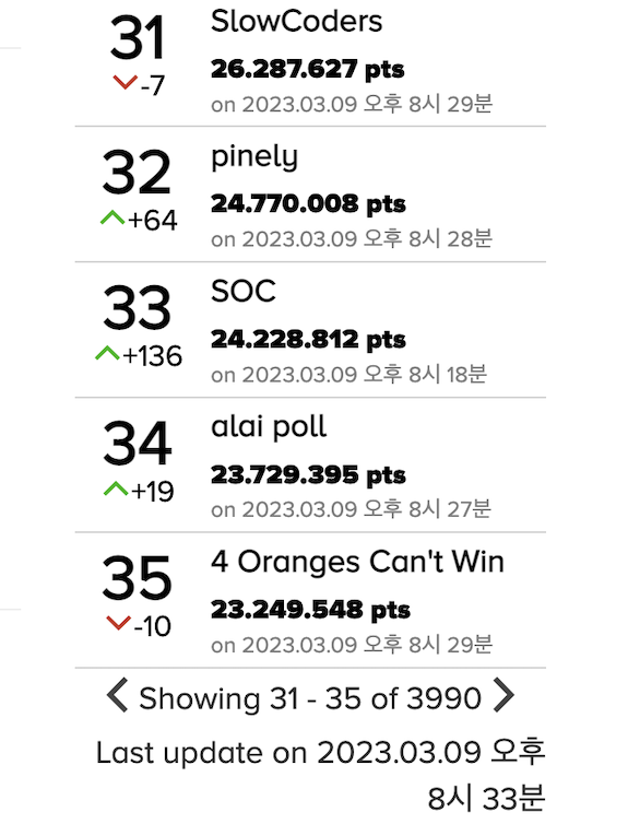 대회가 끝나고 저희 팀은 전체 3,990팀 중 35위를 차지했습니다. 예상치 못했던 좋은 결과였습니다. 그리고 정말 재밌었습니다. 대회 시간 내내 진심으로 즐길 수 있었습니다. 그렇게 대회가 마무리되고 저는 당일 오전 9시에 수업이 있었기 때문에 그대로 동아리 방에서 잠에 들었습니다.