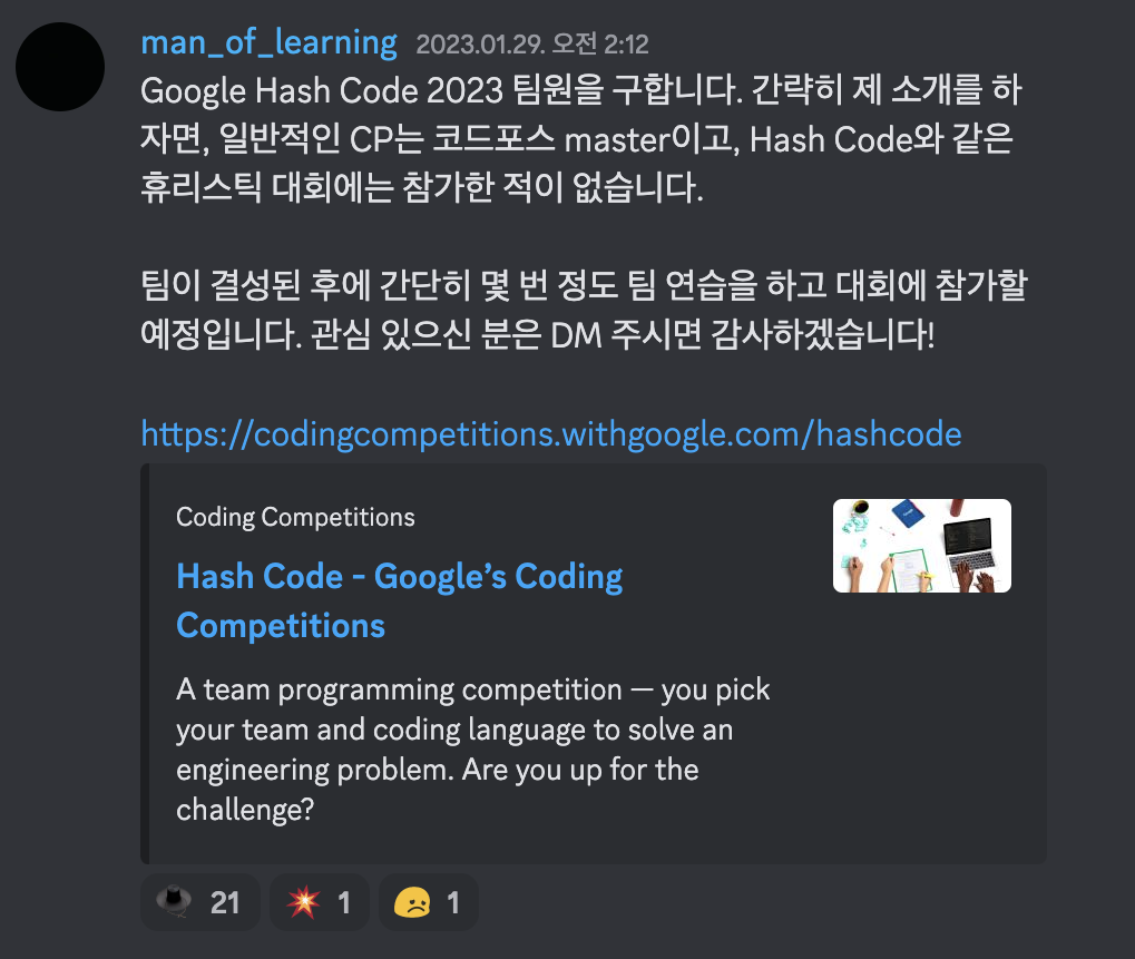 원래 저는 Google Hash Code에 참가하려고 했습니다. 그래서 모 커뮤니티에 Google Hash Code 팀원을 모집하는 글을 업로드했습니다. 글을 올린 후 감사하게도 박신욱님께서 연락을 주셨습니다. 그 후 Hello, BOJ 2023! 때 출제자로 합을 맞췄던 한동규님께 팀 제의를 드렸고, 흔쾌히 수락해주셨습니다. 남은 팀원 한 분을 고민하던 찰나에 박신욱님이 강희원님께 제의를 드려 함께하게 되었습니다. 다들 잘하시는 분들이고, 좋은 팀을 만들었다는 생각에 기대에 부풀어 있었습니다. 그런데...